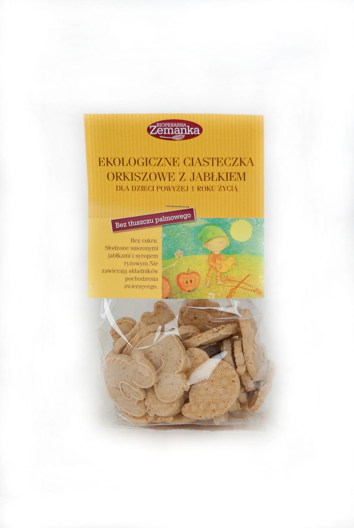 Ekologiczne ciasteczka orkiszowe z jabłkiem dla dzieci powyżej 1 roku życia. Słodzone suszonymi jabłkami i syropem ryżowym. Nie zawierają składników pochodzenia zwierzęcego. Bez tłuszczu palmowego.