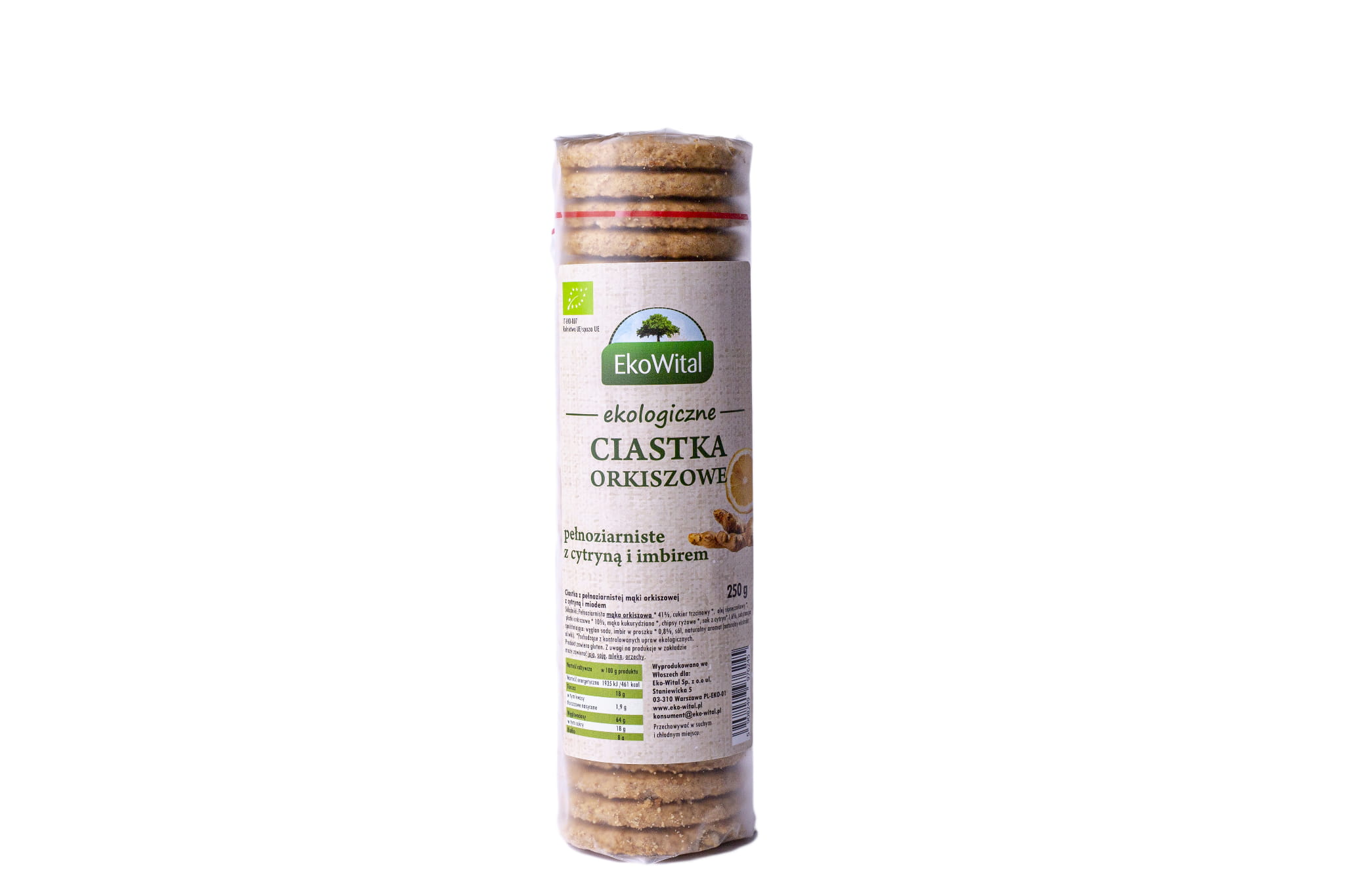 Skład: Pełnoziarnista MĄKA ORKISZOWA* 41%, cukier trzcinowy*, olej słonecznikowy*, płatki orkiszowe* 10%, mąka kukurydziana*, chipsy ryżowe*, sok z cytryn* 1,6%, substancja spulchniająca: węglan sodu, imbir w proszku* 0,8%, sól, naturalny aromat (naturalny ekstrakt oliwki). *Pochodzące z kontrolowanych upraw ekologicznych.