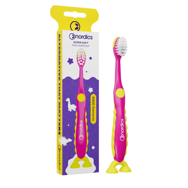 SZCZOTECZKA DO ZĘBÓW DLA DZIECI 6900 SUPER MIĘKKA RÓŻOWO - ŻÓŁTA DINOZAUR - NORDICS