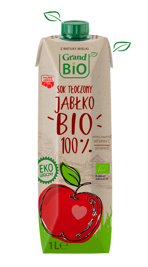 Tłoczony sok jabłkowy 100% (NFC). Wyciskany bezpośrednio z owoców, naturalnie mętny. Polecany szczególnie miłośnikom smaku jabłkowego. Posiada doskonały aromat i znakomite właściwości orzeźwiające.